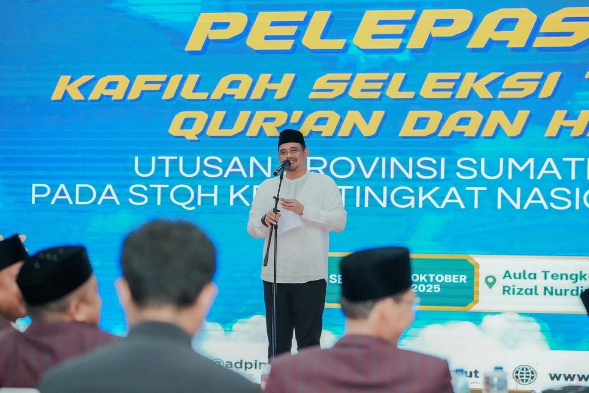 MEDAN – Gubernur Sumatera Utara (Sumut) Bobby Nasution secara resmi melepas keberangkatan Kafilah Sumut, yang akan bertanding di Seleksi Tilawatil Qur’an dan Hadits (STQH) ke-28 tingkat nasional di Kendari, Sulawesi Tenggara. Acara pelepasan berlangsung di Aula Tengku Rizal Nurdin, Jalan Sudirman No. 41 Medan, Selasa (7/10/2025) malam.
