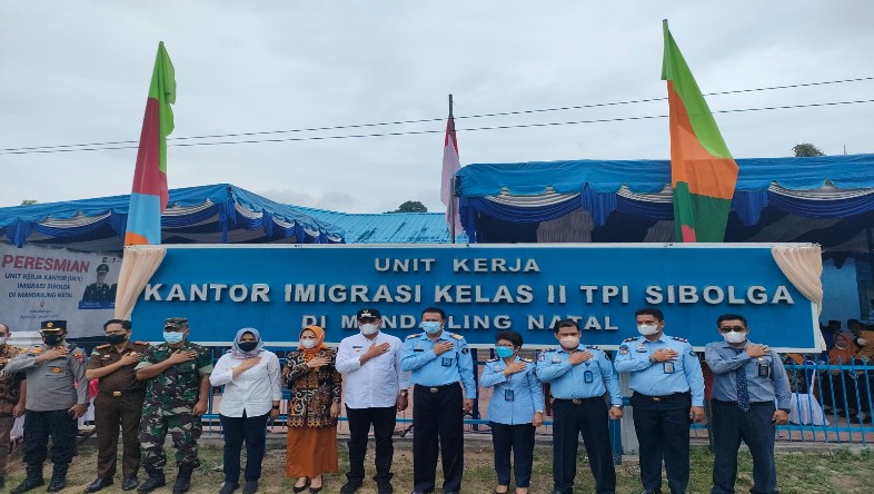 PANYABUNGAN, – Bupati Mandailing Natal (Madina), H. Muhammad Ja’far Sukhairi Nasution menghadiri peresmian Unit Kerja Kantor Imigrasi Kelas II TPI Sibolga di Desa Mompang Julu Kecamatan Panyabungan Kabupaten Madina, Rabu (26/1/2022)
