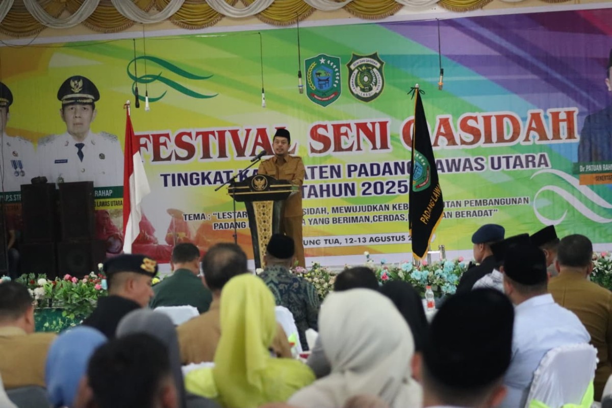 PALUTA – Bupati Padang Lawas Utara (Paluta) Reski Basyah Harahap, S.STP., M.Si Membuka Secara Resmi Penyelenggaraan Festival Seni Qasidah Tingkat Kabupaten Padang Lawas Utara Tahun 2025 dengan tema “Lestarikan Seni Qasidah, Mewujudkan Keberlanjutan Pembangunan Padang Lawas Utara yang Beriman, Cerdas, Maju dan Beradat” dari tanggal 12 s/d 13 Agustus 2025 di Aula Serbaguna Kantor Bupati, Selasa (12/08/2025).