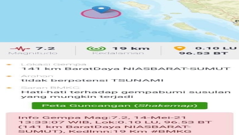 Informasi dari BMKG, gempa yang terjadi pada Jumat siang ini berkekuatan 7,2 magnitude dan berada di kedalaman bawah laut 19 kilometer. Dan, pusat gempa berada di 141 Km barat daya Kabupaten Nias Barat, tepatnya di 0,10 Lintang Utara dan 93,53 Bujur Timur. Informasi dari laman BMKG itu dinyatakan tidak berpotensi tsunami. (MN-07/int)