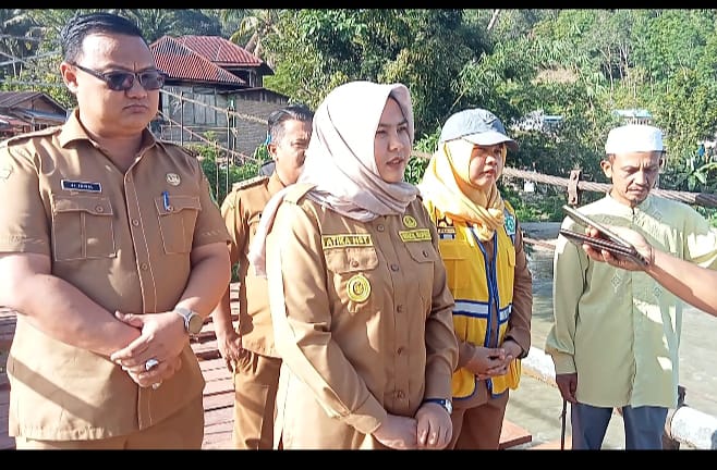 Wakil Bupati Madina Atika Azmi Utammi Nasution didampingi Kepala Dinas PUPR Elpi Yanti Harahap, serta Kepala Dinas Kesehatan dr. Mhd. Faisal Situmorang meninjau progres pengerjaan jembatan tersebut, Selasa (27/5/2025).