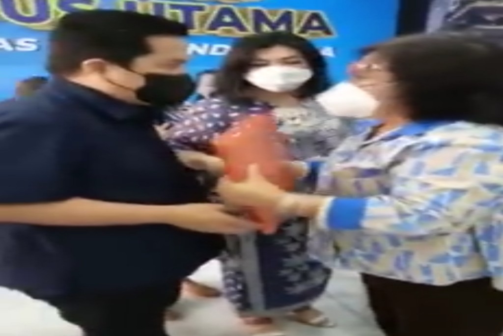 Dalam video berdurasi 35 detik itu yang diunggah di beberapa akun media sosial, termasuk akun FB Ridwan Rangkuti. ibu-ibu itu terlihat mencegat Erick Tohir yang sedang berjalan bersama beberapa pejabat lainnya. Ibu-ibu berkacamata yang mengenakan baju bercorak warna biru dan stelan celana putih itu sempat menyampaikan sesuatu kepada Menteri BUMN Erick Tohir, lalu menyerahkan sebuah dokumen